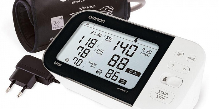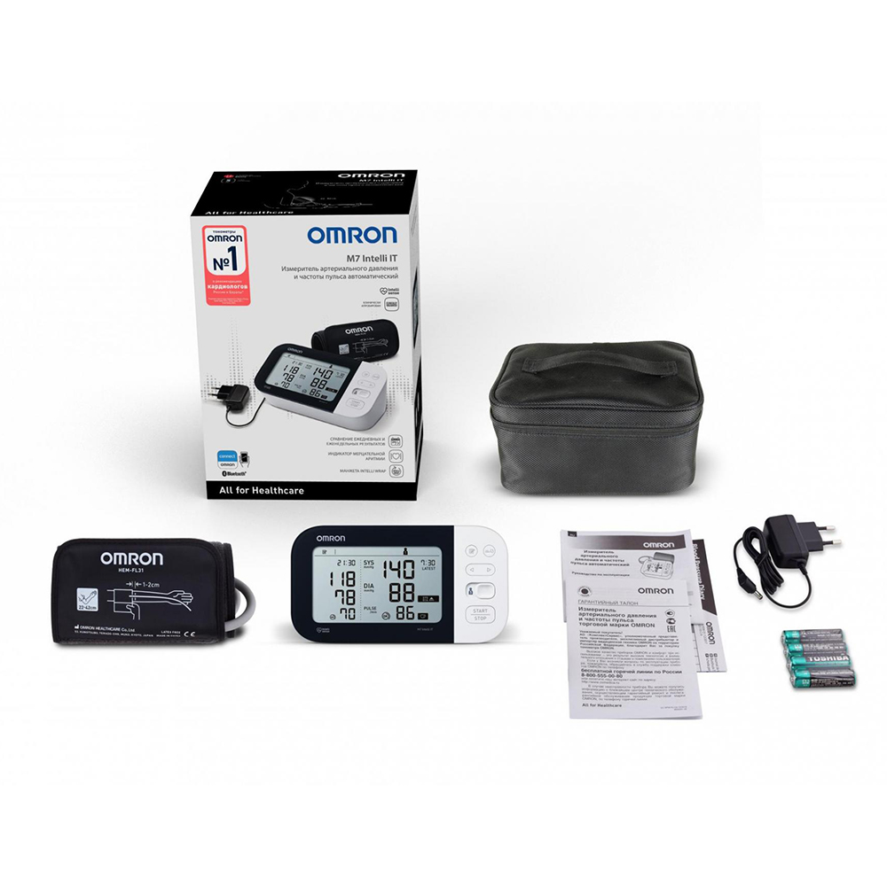 OMRON M7 Intelli IT – многофункциональный автоматический тонометр на плечо в комплектации с умной манжетой Intelli Wrap Cuff и адаптером.